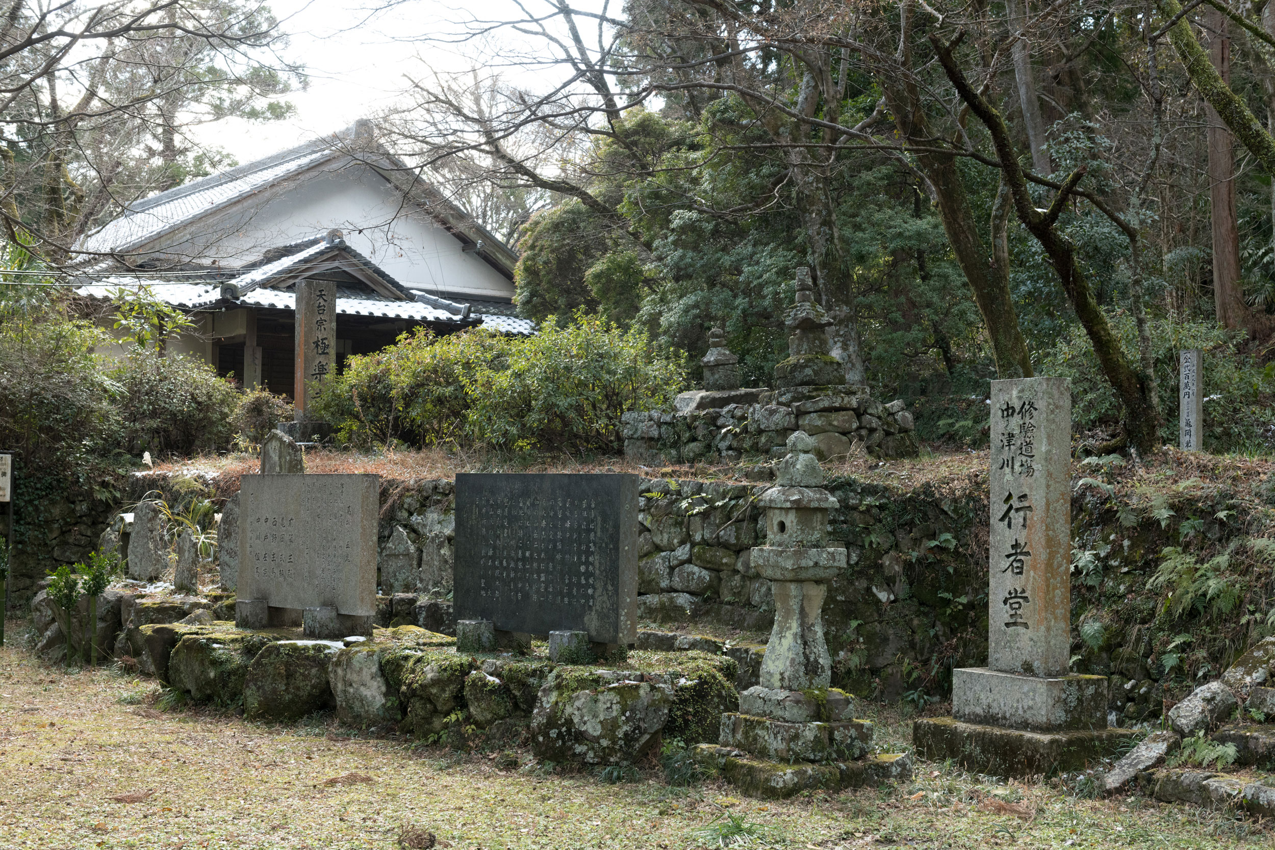 葛城灌頂(かつらぎかんぢょう)という特殊な儀礼が行われてきた葛城修験における重要な拠点、中津川行者堂。人里から離れた境内には、由緒を記した石碑も