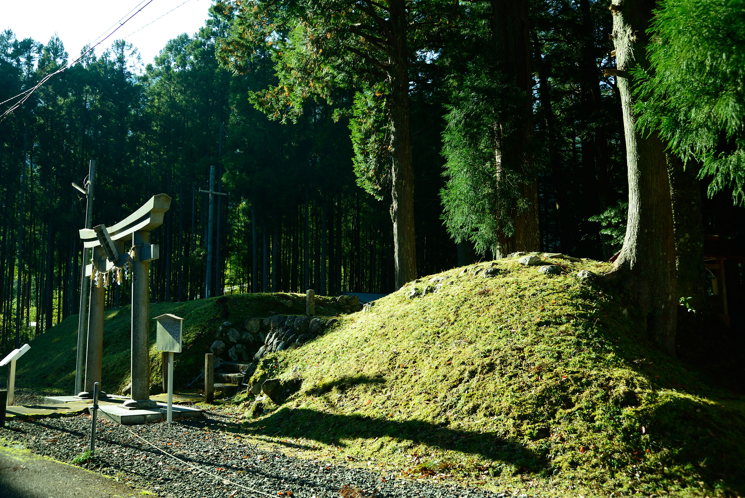 護良親王と竹原八郎の娘である雛鶴姫の間には若君が生まれましたが幼くして亡くなり、土地の人々がその御霊を尊んでお祀りし、創建したのがこの神社。境内は背の高い杉林に囲まれて厳かな雰囲気に満ちています。神明造のお社の脇には、北山村の竹原区・七色区それぞれの山の神様を祀った丸石が置かれています。